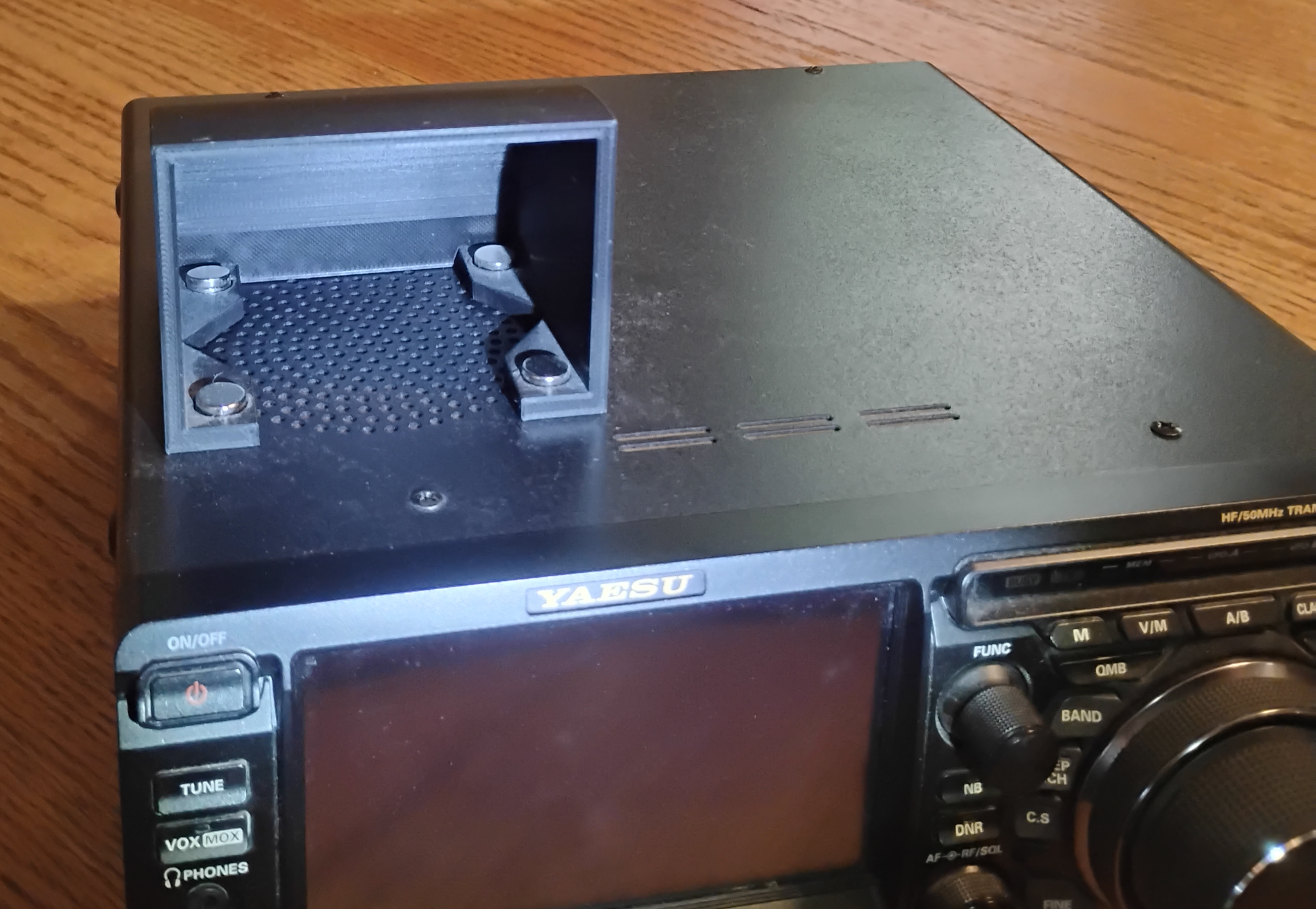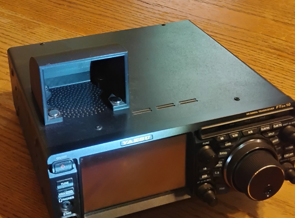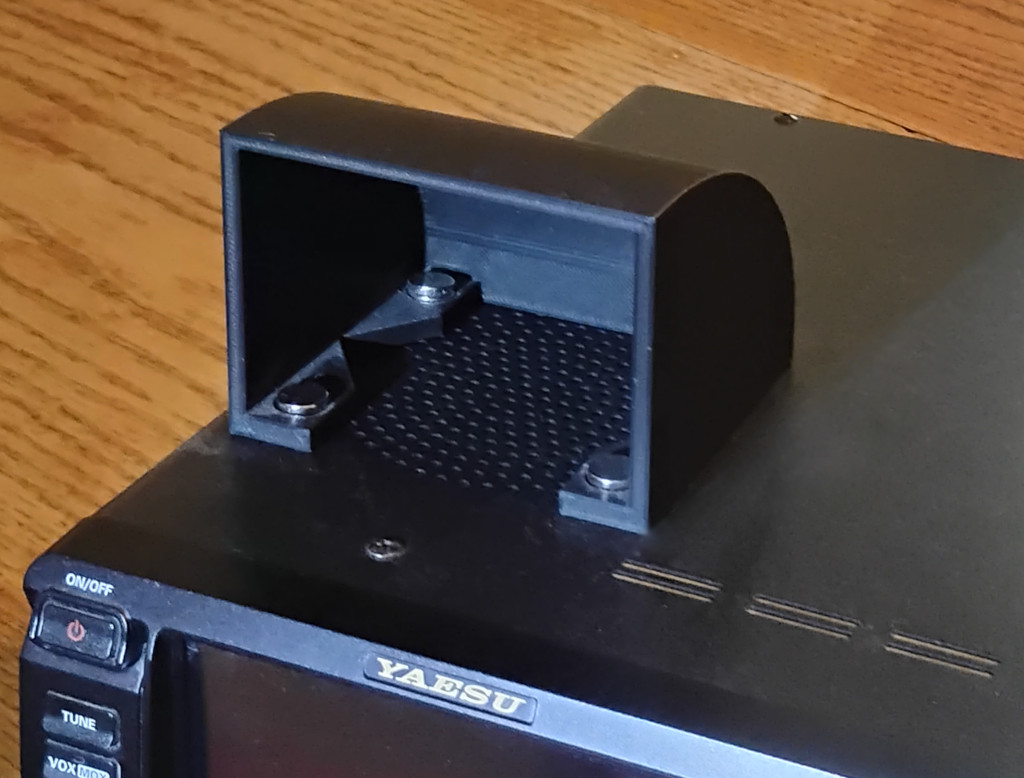 The FTDX10 audio director uses magnets to connect to the top of the radio. I designed it myself in Blender, and print it myself on my 3D printer. It was modeled to fit on top of a Yaesu FTDX10 radio. It may fit on other radios as well (spefically, my dad says it should work on an ICOM IC7300, and probably a ton of other radios).