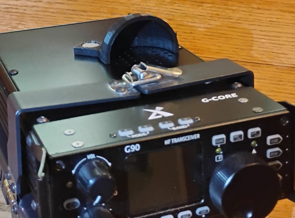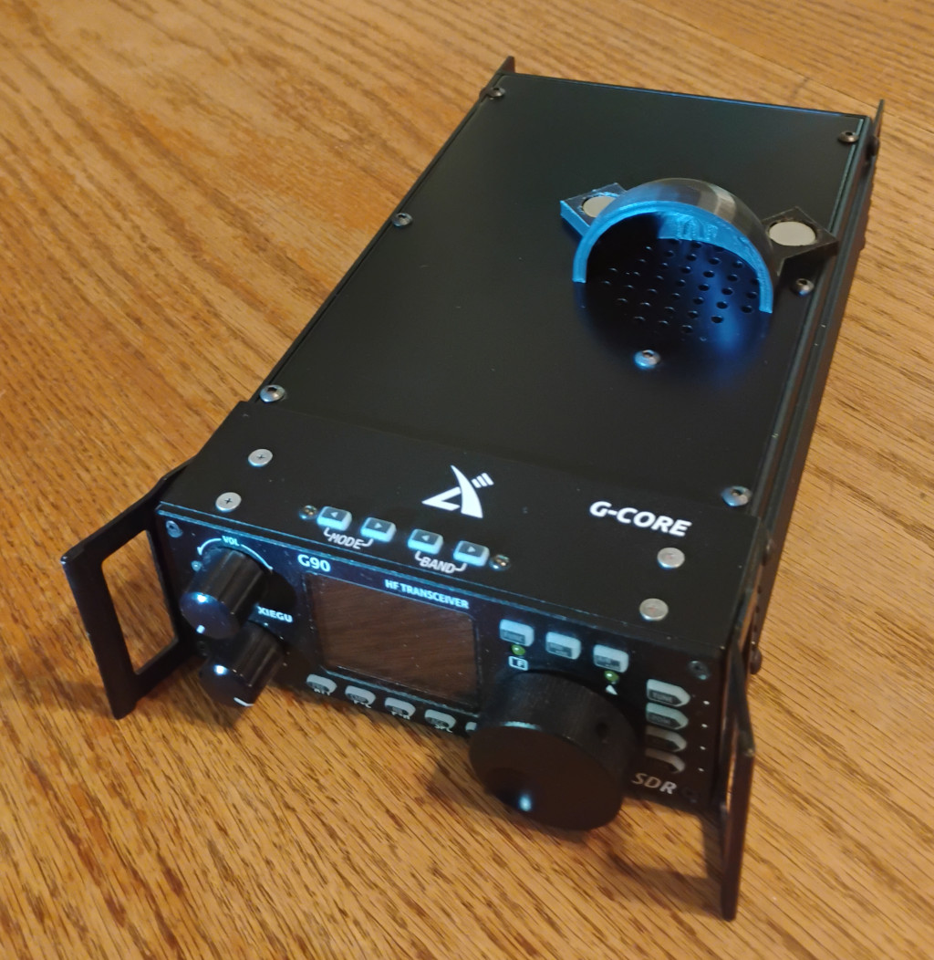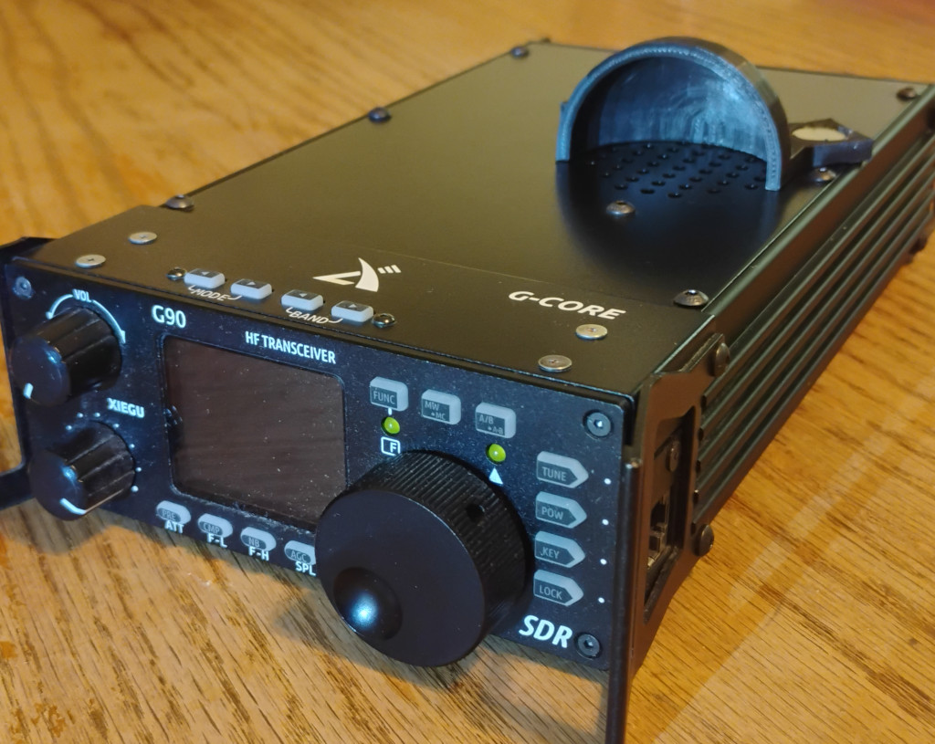The G90 audio director uses magnets to connect to the top of the radio. I designed it myself in Blender, and print it myself on my 3D printer. It was modeled to fit on top of a Xiego G90 radio while maintaining a relatively low profile. It may fit on other radios as well (spefically, my dad says it should work on an FT-857 and FT-818 radio).